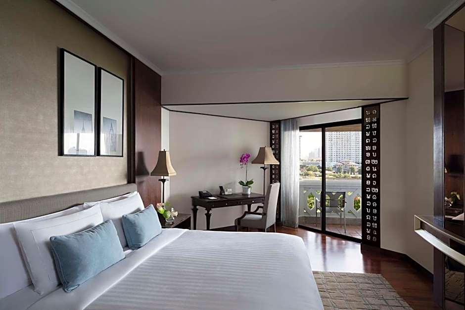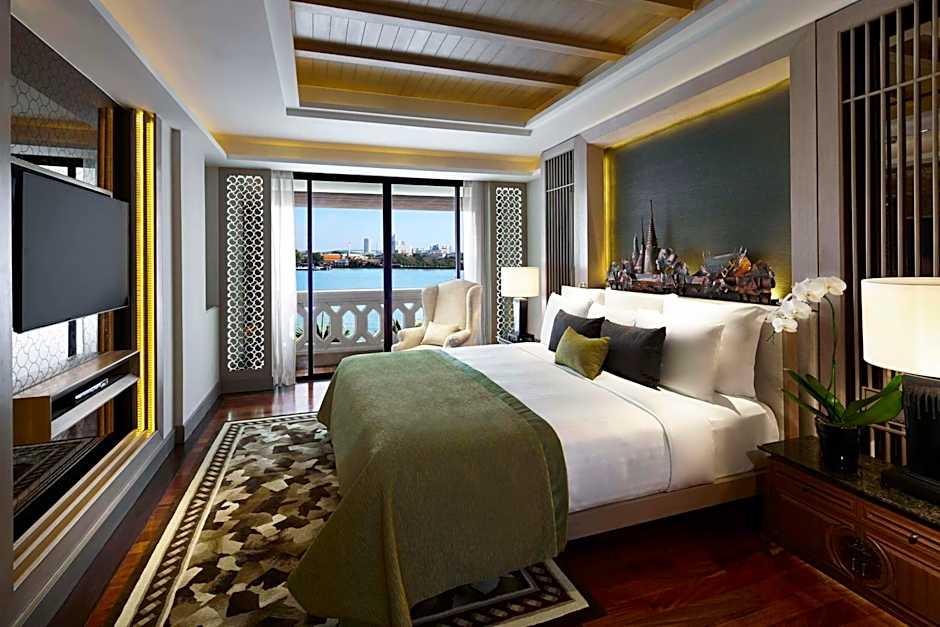 Features floor-to-ceiling windows and a balcony with views of the Chao Phraya River.